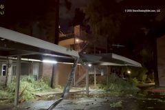 01:04 Various clips showing large trees taken down at an apartment complex by the damaging winds, causing damage to the carports and vehicles underneath them.